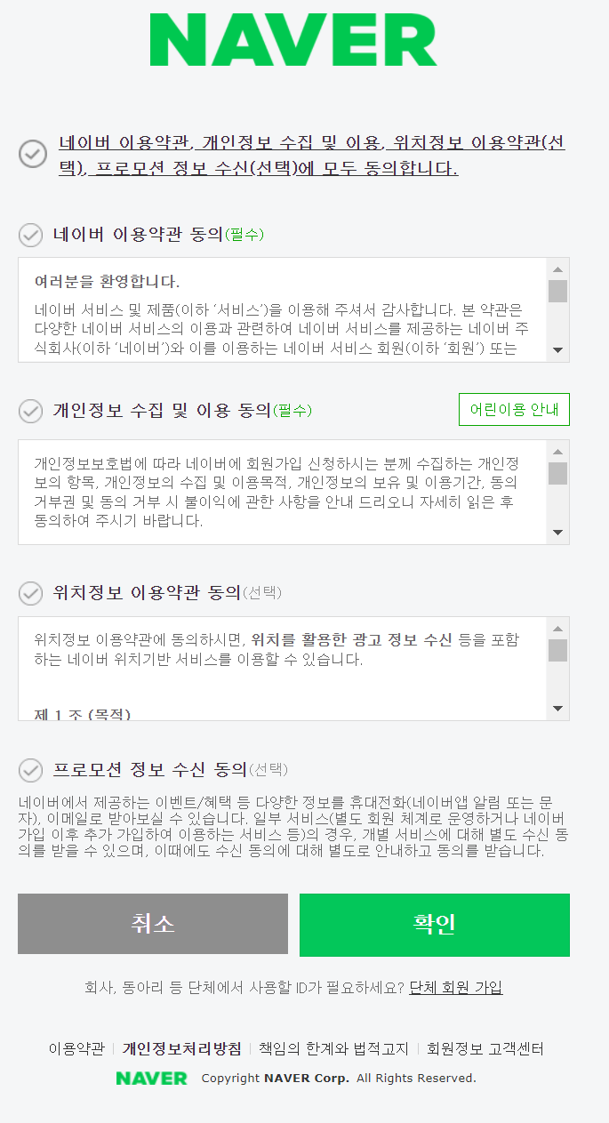 <input type="checkbox" name="ch1"><span>네이버 이용약관, 개인정보 수집 및 이용, 위치정보 이용약관(선택), 프로모션 정보 수신(선택)에 모두 동의합니다.</span>